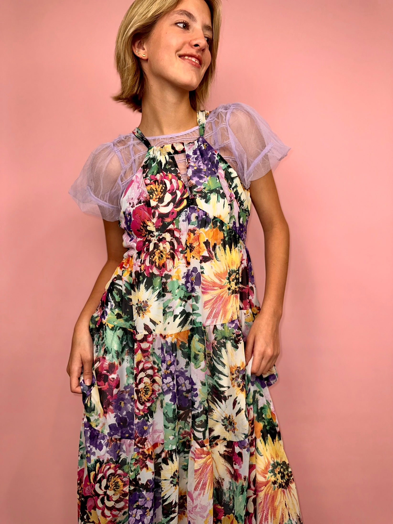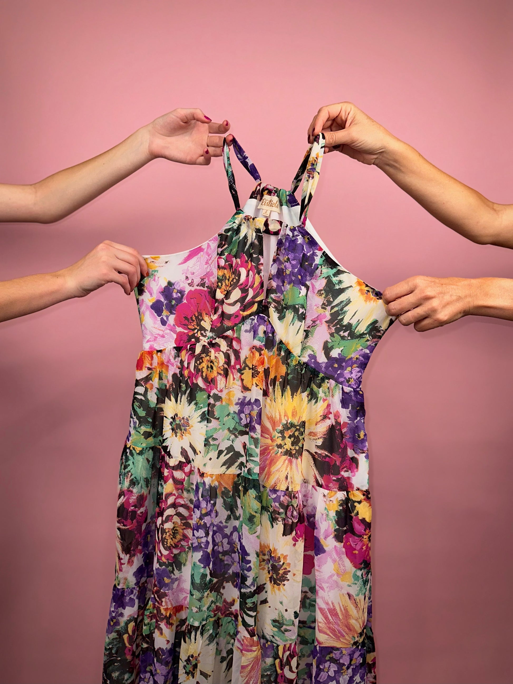 The Katie Maxi Dress is a vibrant celebration of florals and flow, perfect for those who love bold prints and effortless style. Featuring an explosion of colorful blooms in shades of purple, yellow, pink, and green, this dress brings a garden of beauty to life. The halter neckline adds a touch of elegance, while the tiered design offers a breezy, relaxed fit that moves gracefully with you. Ideal for casual days or special occasions, this maxi dress is a standout piece that embraces the beauty of nature.