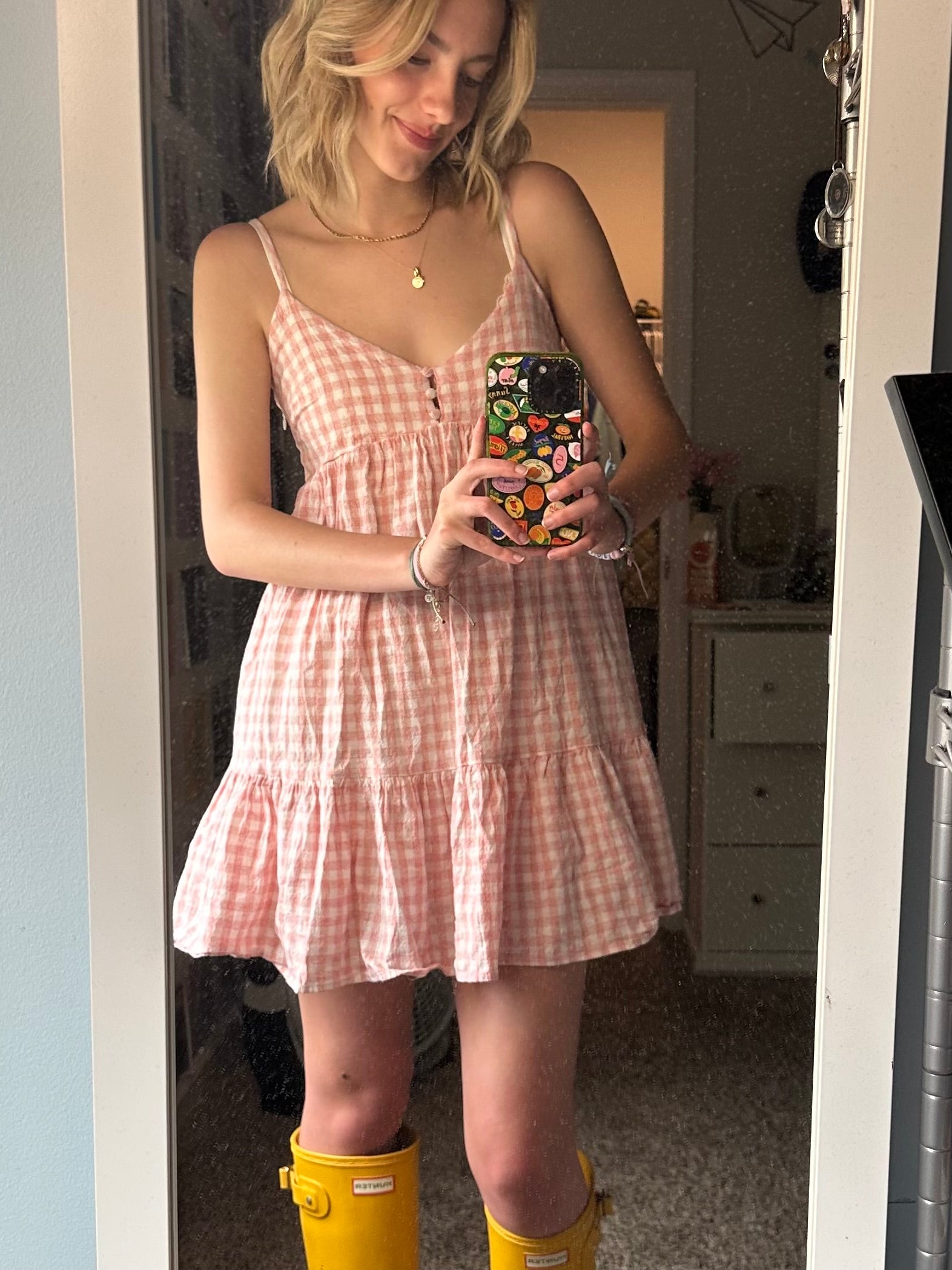 Sweet, light, and refreshing—just like its namesake—the Pink Lemonade Mini Dress is the perfect piece for sun-soaked days and carefree adventures. This dress features a soft pink gingham pattern, with delicate spaghetti straps and a tiered silhouette that adds playful movement. The lightweight fabric and relaxed fit make it a go-to for those days when you want to keep things easy and breezy, while still looking effortlessly chic.